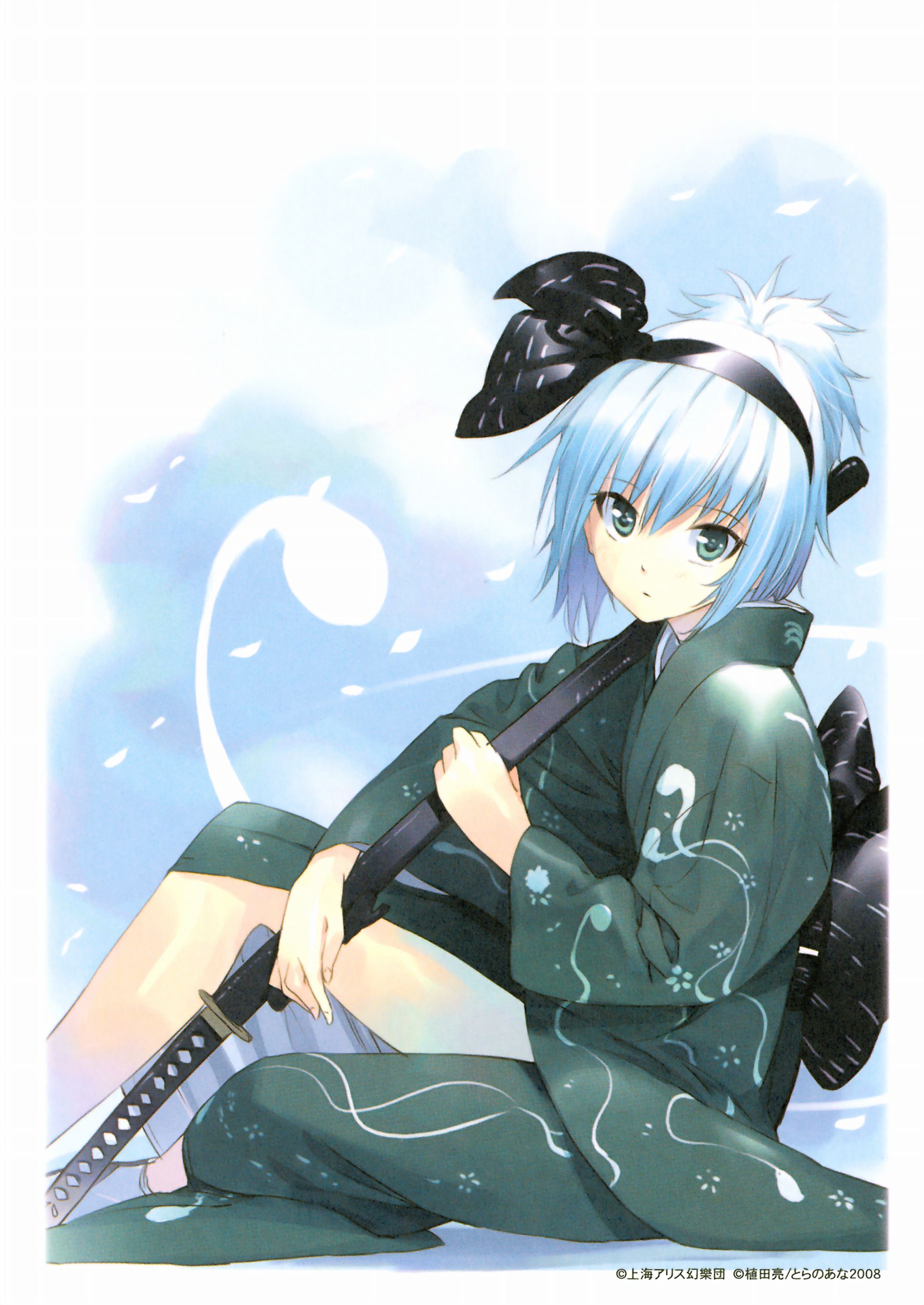 1girlalternate costumefemale focusgreen eyeshitodamajapanese clotheskatanakimonoscabbardsheathsheathedsittingsoloswordweaponwhite hair
