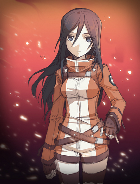 00s1girlbeltblack hairblue eyesfemale focusfingerless glovesgloveslong hairsketchsmilesolothighhighszettai ryouiki