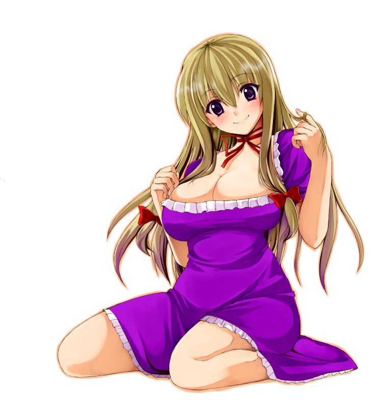1girlblonde hairbreastscleavagefemale focusfull bodyhair ribbonlong hairpurple eyesribbonsimple backgroundsmilesolowhite background