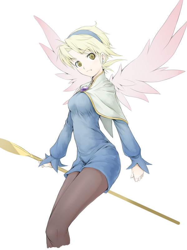 1girlangel wingsblonde hairbreastscowboy shotdressfemale focusgreen eyeslarge breastslooking at viewerpantyhoseshort dressshort hairsimple backgroundsolostaffwhite backgroundwhite wingswings