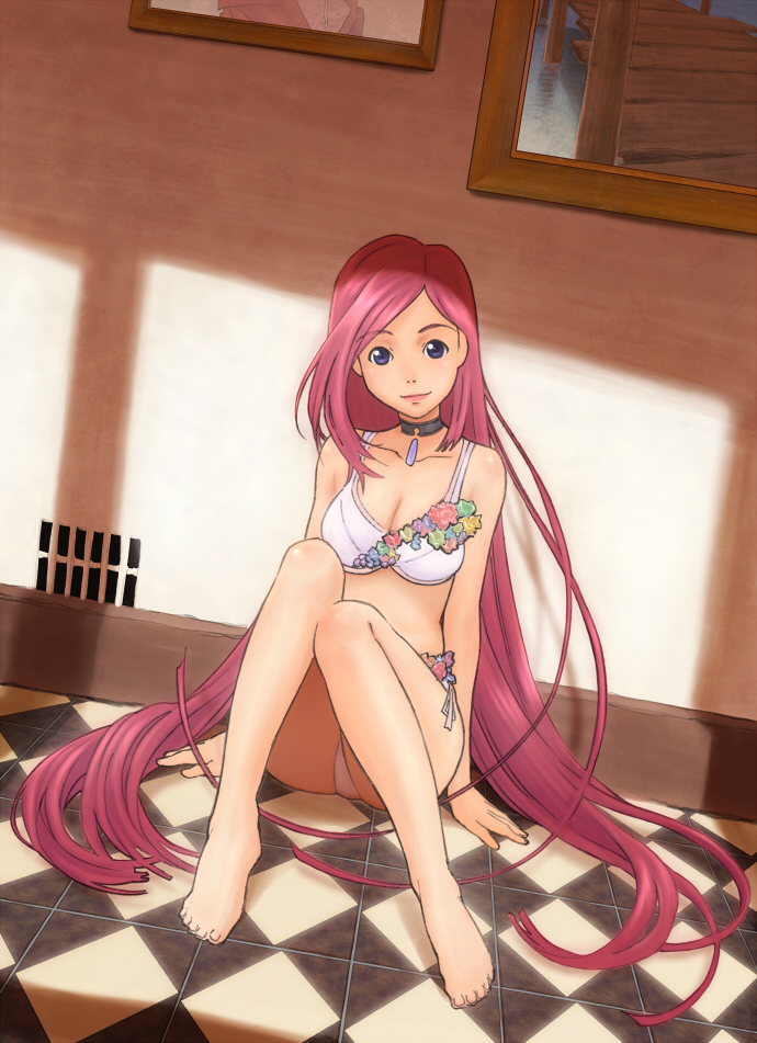 1girlbarefootbikinichokerdutch anglefeetfemale focuslegslipslong hairpink hairpurple eyessoloswimsuitvery long hairwhite bikini