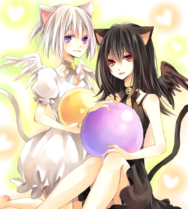 asanagi, kaenbyou rin, reiuji utsuho, touhou, bad id, bad pixiv id, highres, 2girls, animal ears, blood, braid, brown hair, cat ears, cat girl, fang, female focus, hands on feet, long hair, multiple girls, pout, red eyes, red hair, sitting, twin braids, twintails