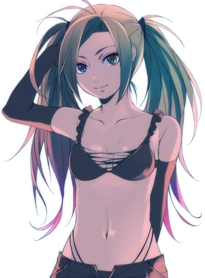 1girlbare shouldersbikinibikini top onlyblue eyesbreastscollarboneelbow glovesfemale focusglovesgreen eyesgreen hairheterochromialong hairlooking at viewermatching hair/eyesmedium breastspantiessimple backgroundsoloswimsuitthongtwintailsunderwear