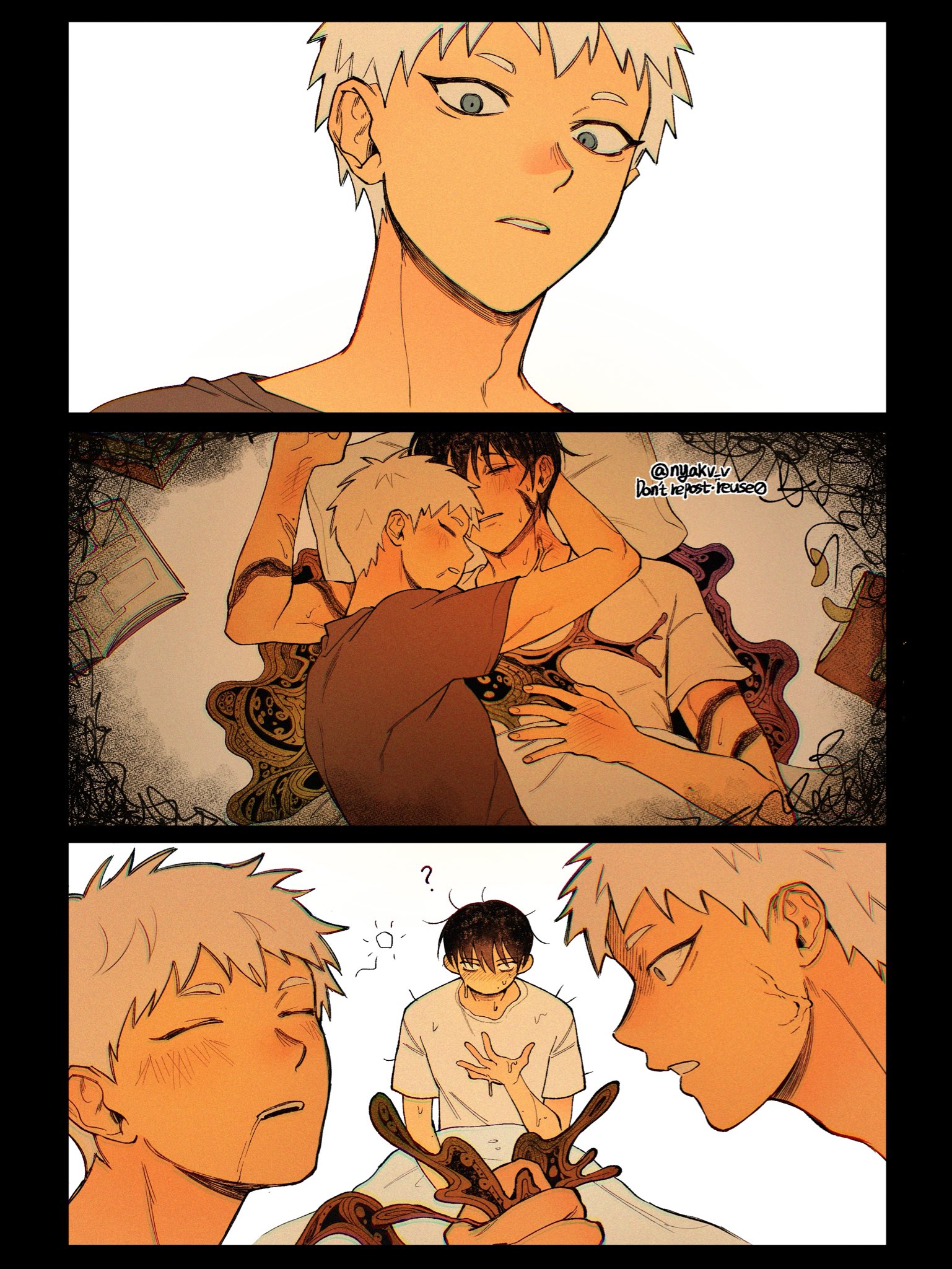 1boy3boysadam's appleblack hairblack shirtblue eyesblushdroolingdual personahand blushindou hikaru (human)male focusmolemole on armmole on cheekmole under mouthmultiple boysmultiple molesneck blushnyakv vpillowshirtshort hairsleepingsleeping on personsleeping togethertwitter usernamewhite hairwhite shirt