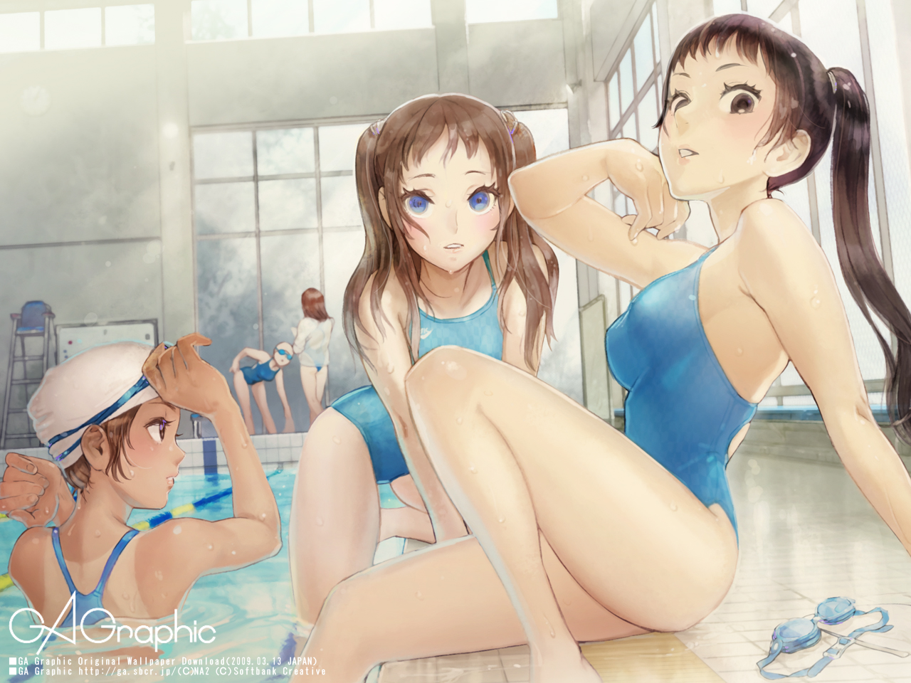 5girlsblue eyesbrown eyesbrown hairchaircompetition swimsuitdateddutch anglegogglesgoggles on headindoorslane linelifeguard chairlight rayslong hairlooking at viewermultiple girlsone-piece swimsuitone-piece tanparted lipsponytailpoolpoolsideprofileripplesshort hairsunbeamsunlightswim capswimsuittantanlinetwintailsunworn goggleswatermarkweb addresswetwindow