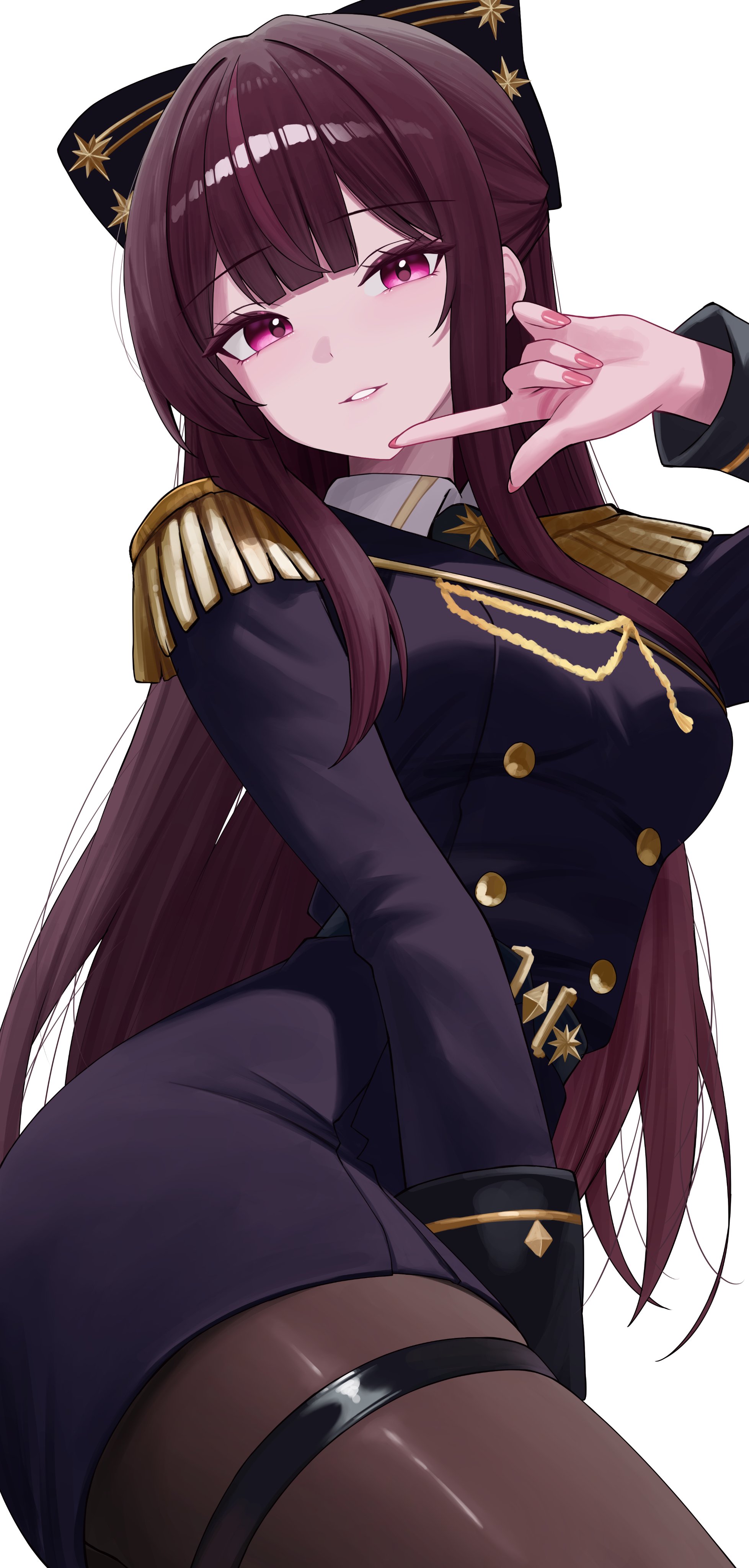 1girlaiguilletteblack dressbowbreastsbrown pantyhosebuttonscowboy shotdouble-breasteddressepaulettesgrinhair bowhalf updolong hairlong sleeveslooking at viewermedium breastsmulticolored hairpantyhosepurple eyespurple hairsimple backgroundsmilesolostreaked hairthigh strapvirtual youtuberwhite backgroundwing collar