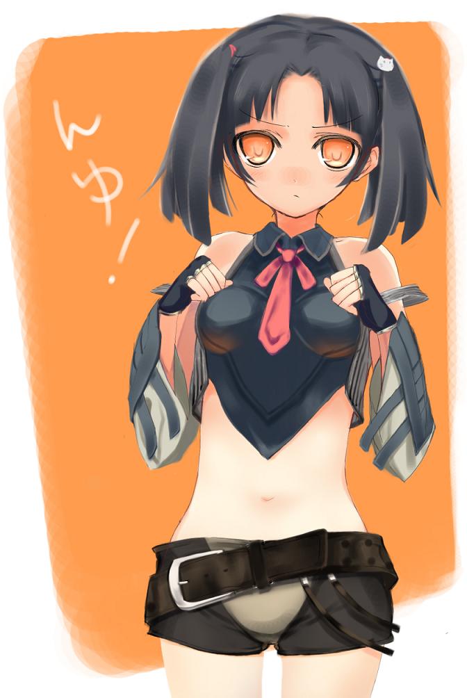 1girlblack hairbreastsfemale focusfingerless glovesgloveshair ornamenthairclipmidriffnavelshort hairshortssolo