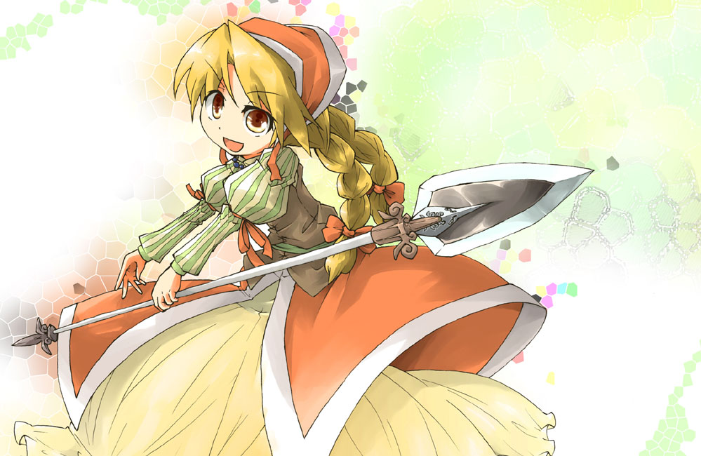 1girlblonde hairbonnetbraidfemale focushair ribbonpolearmred eyesribbonsolospeartwin braidsweapon