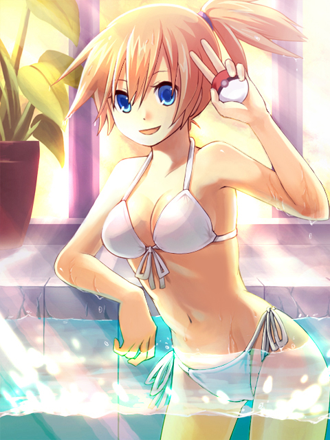 :d1girlbikiniblue eyesfemale focusfront-tie bikini topfront-tie topgym leaderholdingholding poke ballleaning to the sidelight raysnavelopen mouthorange hairplantpoke ballside ponytailside-tie bikini bottomsmilesolostring bikinisunbeamsunlightswimsuitvwadingwaterwhite bikini