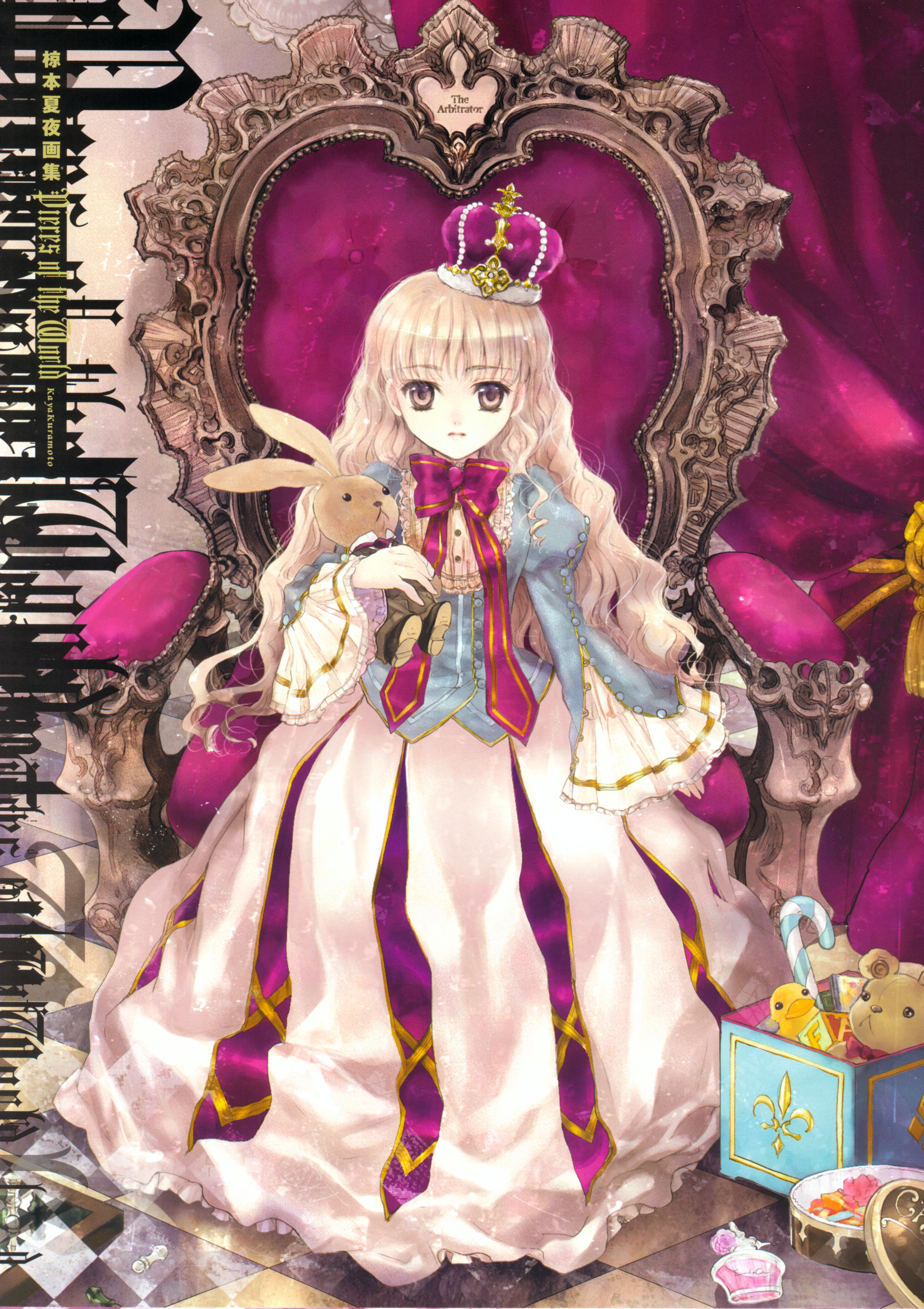 1girlblonde hairbrown eyescrowndressfemale focusgownlong hairprincessrabbitred crownsolostuffed animalstuffed rabbitstuffed toyteddy bearthronetoybox