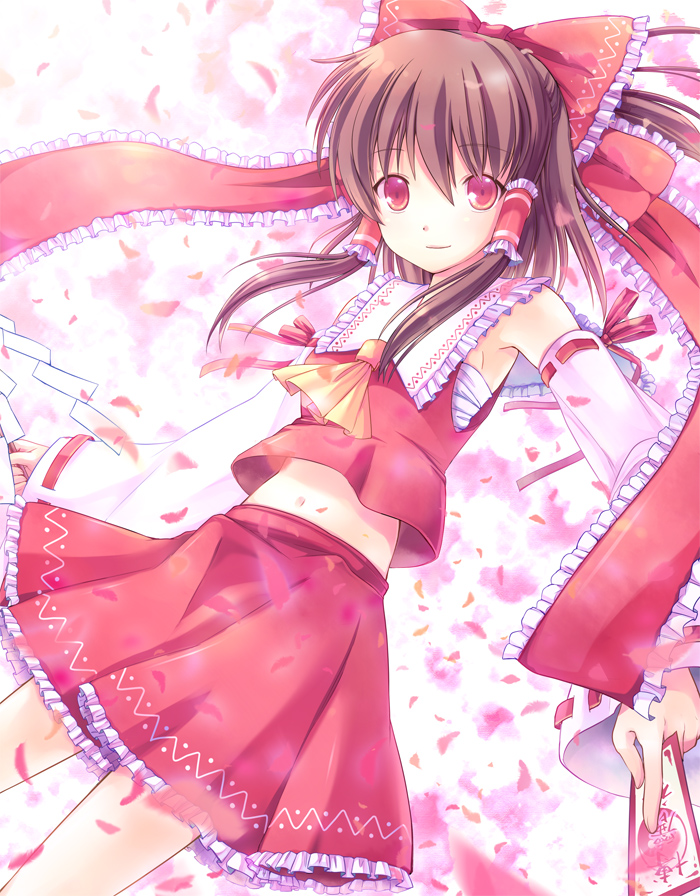 1girlarmpitsbowbrown haircherry blossomsdetached sleevesfemale focusgoheihair bowjapanese clothesmidriffmikonavelsarashiskirtsolo