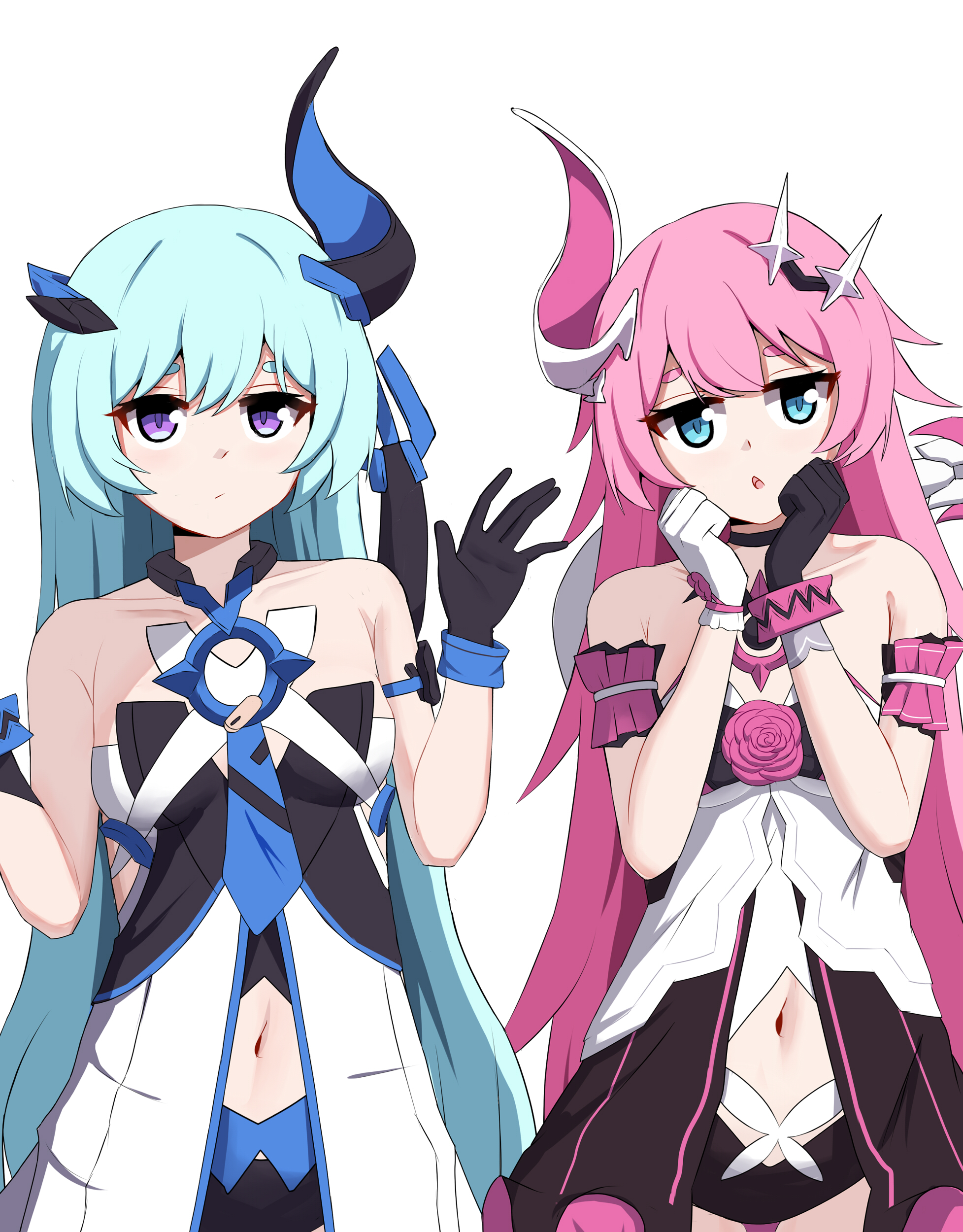 2girlsasymmetrical glovesbare shouldersblack glovesblue eyesblue hairbreastsdressflowergloveshair between eyeshands uphornsmismatched glovesmultiple girlsnavelpink flowerpink hairpink rosepurple eyesroseshort eyebrowssiblingssimple backgroundsingle hornsisterssmall breastsstraplessstrapless dressthick eyebrowstwinswhite backgroundwhite dresswhite gloves
