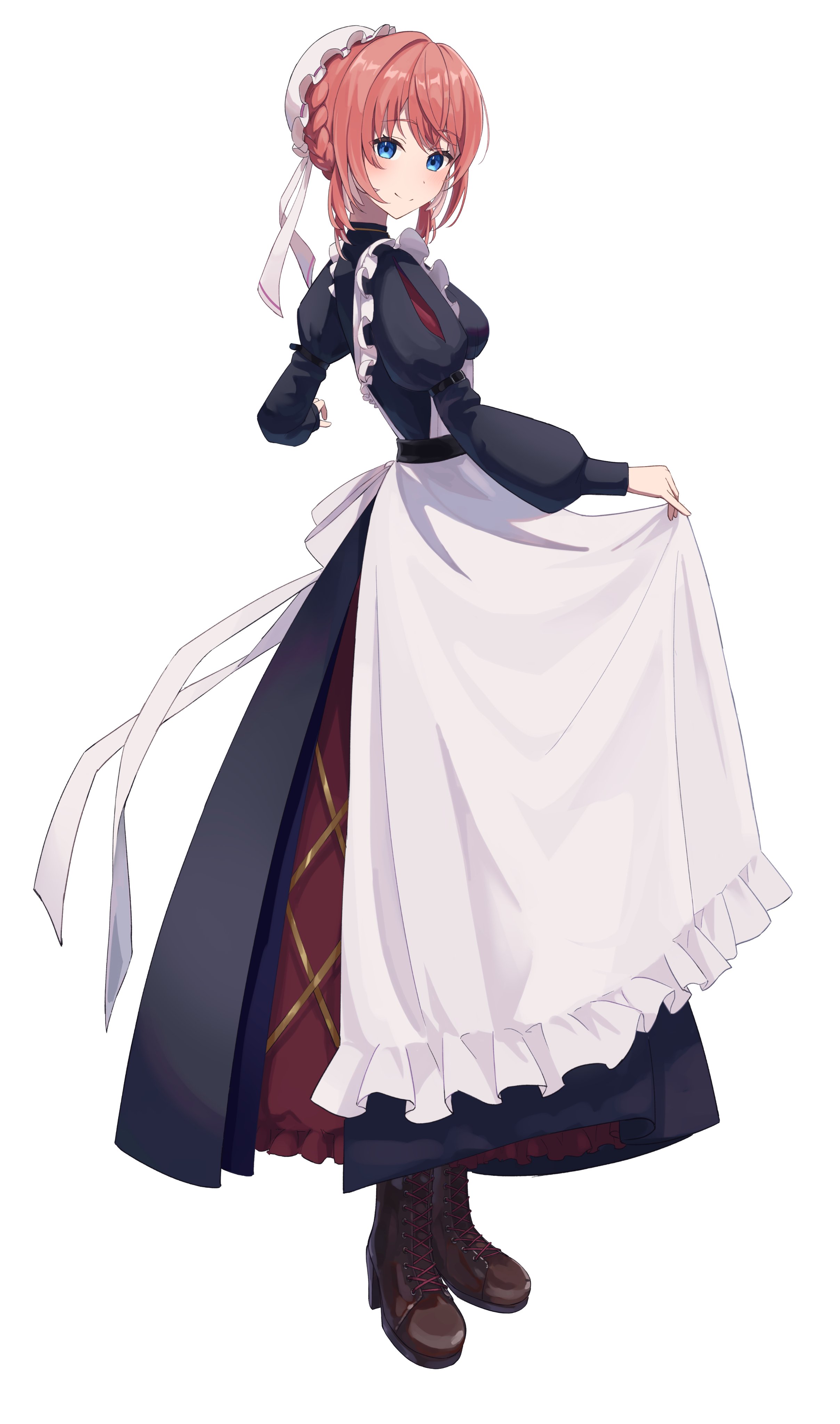 apronblack dressblue eyesbonnetbootsbraidbreastsdressfull bodylight smilelooking at viewermaidmaid apronpink hairshort hairvirtual youtuberwhite background