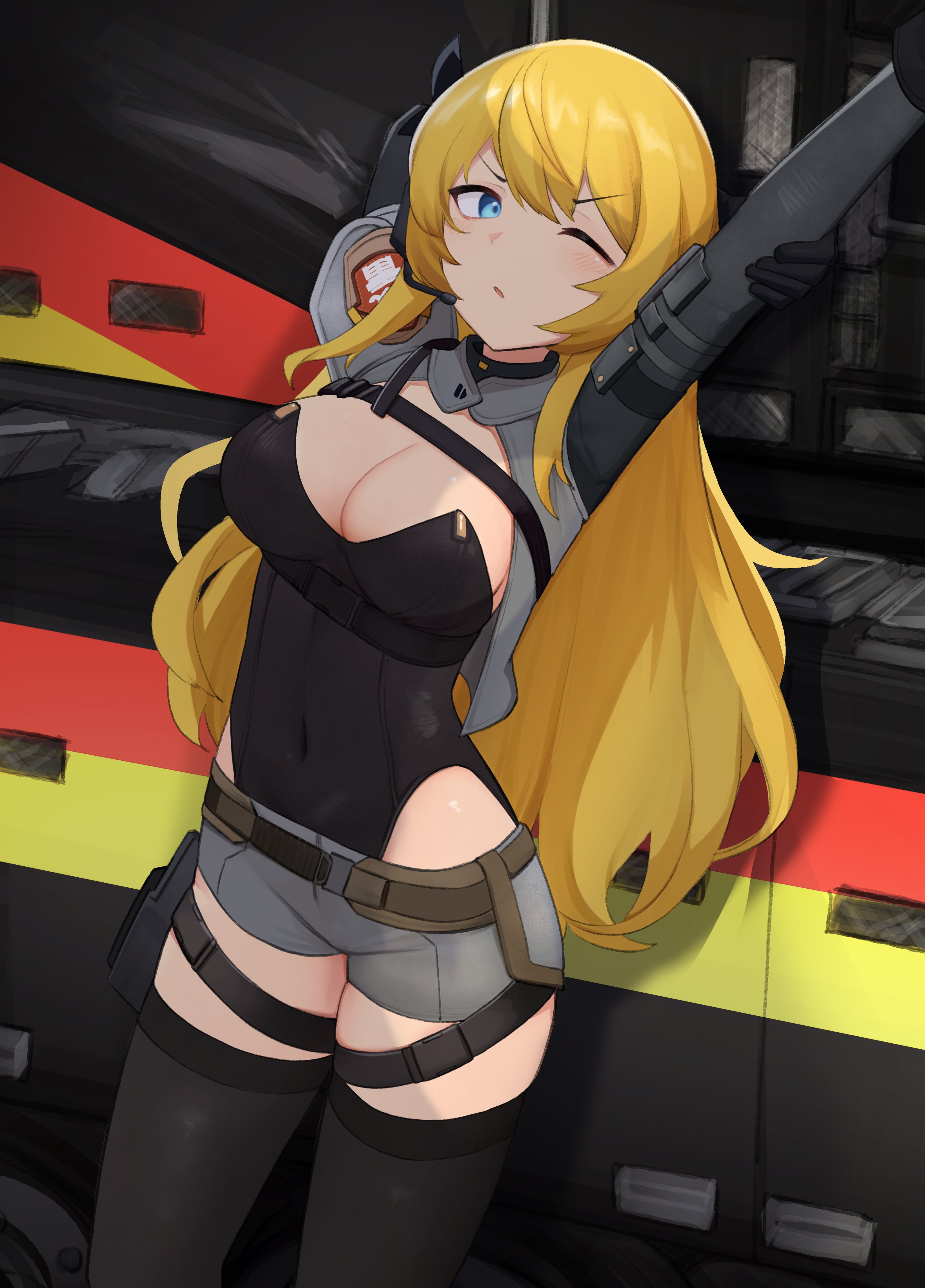 kyo (kuroichigo), yoko littner, tengen toppa gurren lagann, 00s, 1girl, asymmetrical gloves, bikini, breasts, character name, cleavage, female focus, foreshortening, gloves, midriff, monochrome, ponytail, sketch, solo, swimsuit, thighhighs, uneven gloves