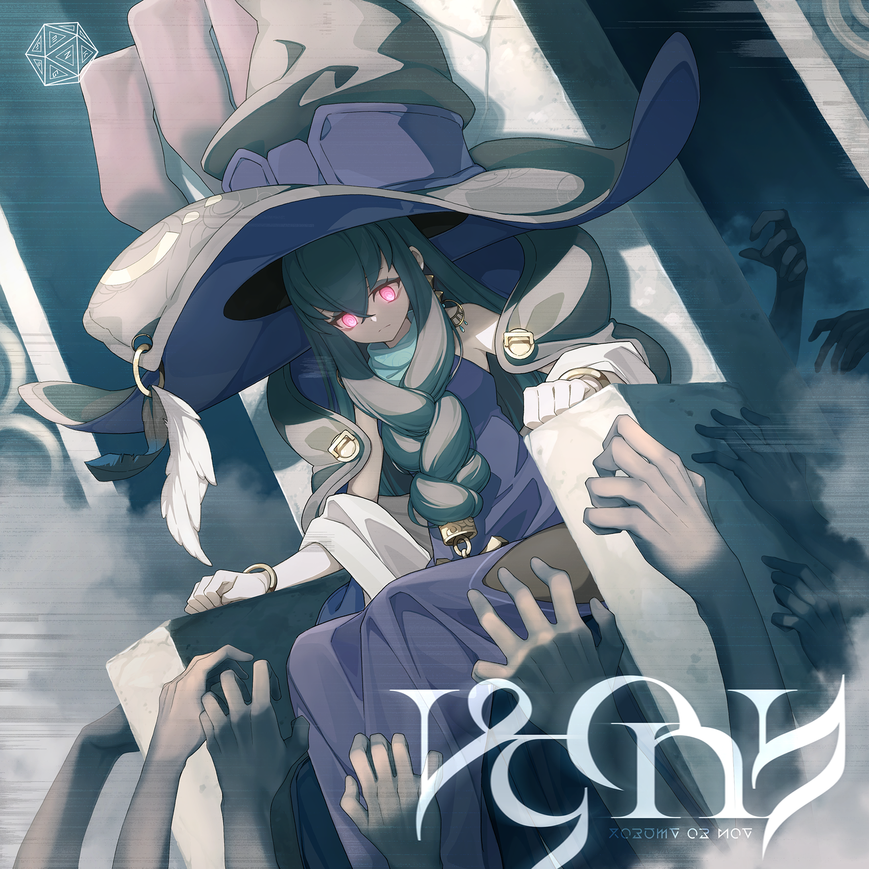 1girlalbum coverblack hairbraidclosed mouthclothing cutoutcoverdressexpressionlessfront braidgrey hathathip ventlong dresslong hairlong sidelockspink eyespurple dresssidelockssitting on thronesleevelesssleeveless dresssolo focussurrounded by handsthronevery long hairvery long sidelockswitch hat