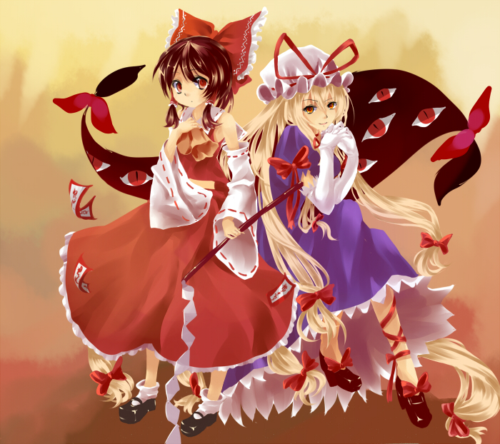 2girlsblonde hairbowbrown hairdetached sleeveselbow glovesfemale focusgap (touhou)gloveshatjapanese clotheslong hairmikomultiple girlsred eyesshort hair