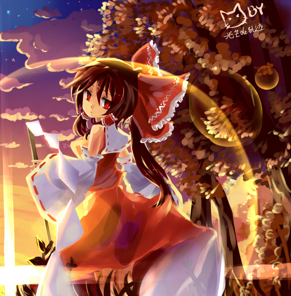 1girlbowbrown hairdetached sleevesfemale focusgoheihair bowjapanese clotheslens flaremikonatureoutdoorsplantponytailskirtskysolosunset
