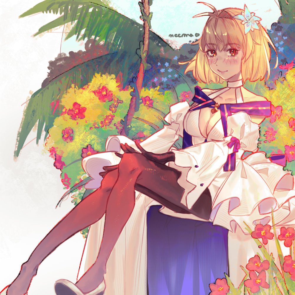 1girlahogebare shouldersblonde hairblue ribbonblushbreastscleavagedetached sleevesdressfloating hairglovesgold trimhair between eyeshair ornamenthands on own thighslooking at viewerpantyhosered eyesribbonshort hairsittingsmilewavy hairwhite dress