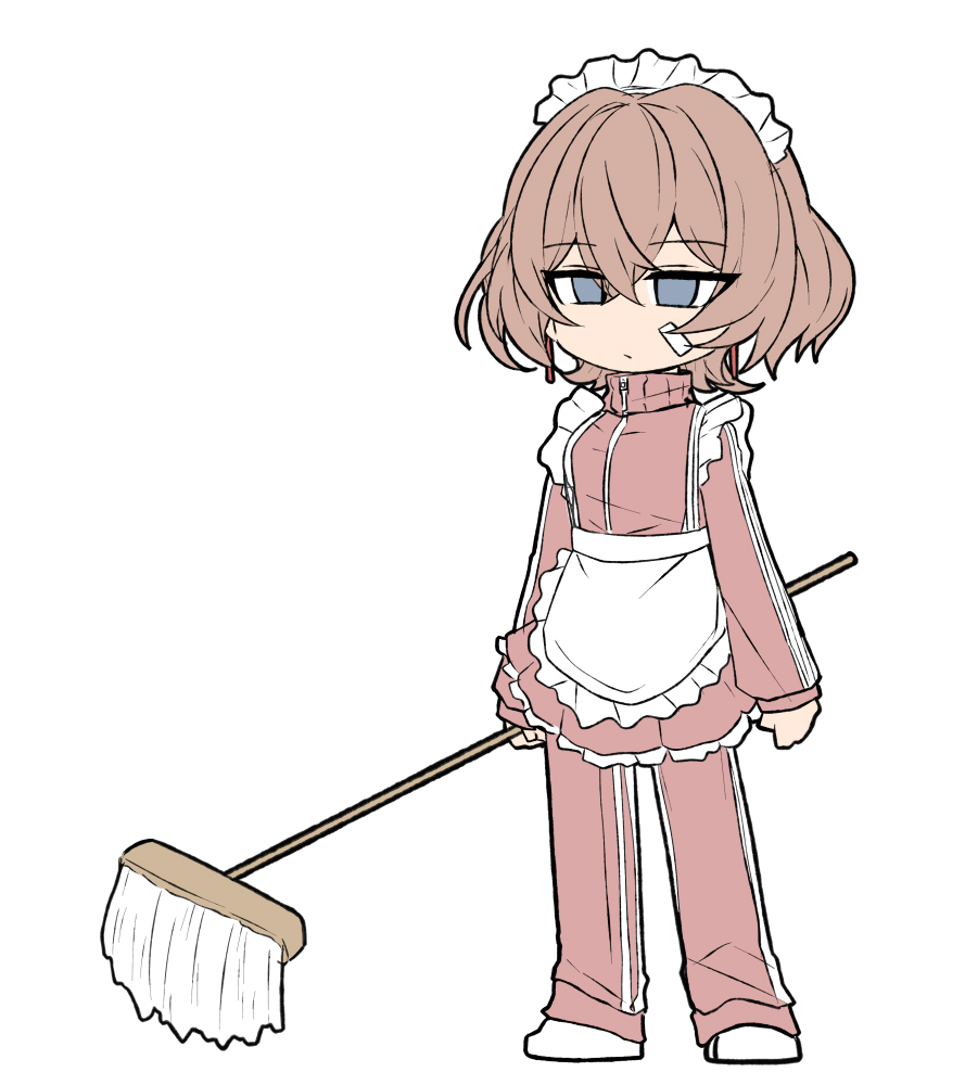 1girlalternate costumeapronblue eyesbrown hairchibiclosed mouthempty eyesenmaidedfrilled apronfrillsfull bodyhair between eyesholdingholding mopjacketjersey maidlong sleevesmaidmaid headdressmoppantspuffy long sleevespuffy sleevesred jacketred pantsshoessimple backgroundsleeves past wristssolostandingtrack jackettrack pantstrack suitunconventional maidwhite apronwhite backgroundwhite shoes