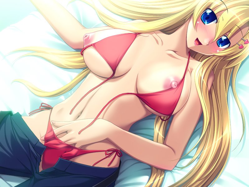 1girlbikinibikini tanblonde hairblue eyesbreastsfemale focusfingernailshand under clotheshand under swimsuitheartlarge breastslipslipsticklong hairmakeupnavelnipplesopen mouthpantsred bikinismilesoloswimsuittantanline