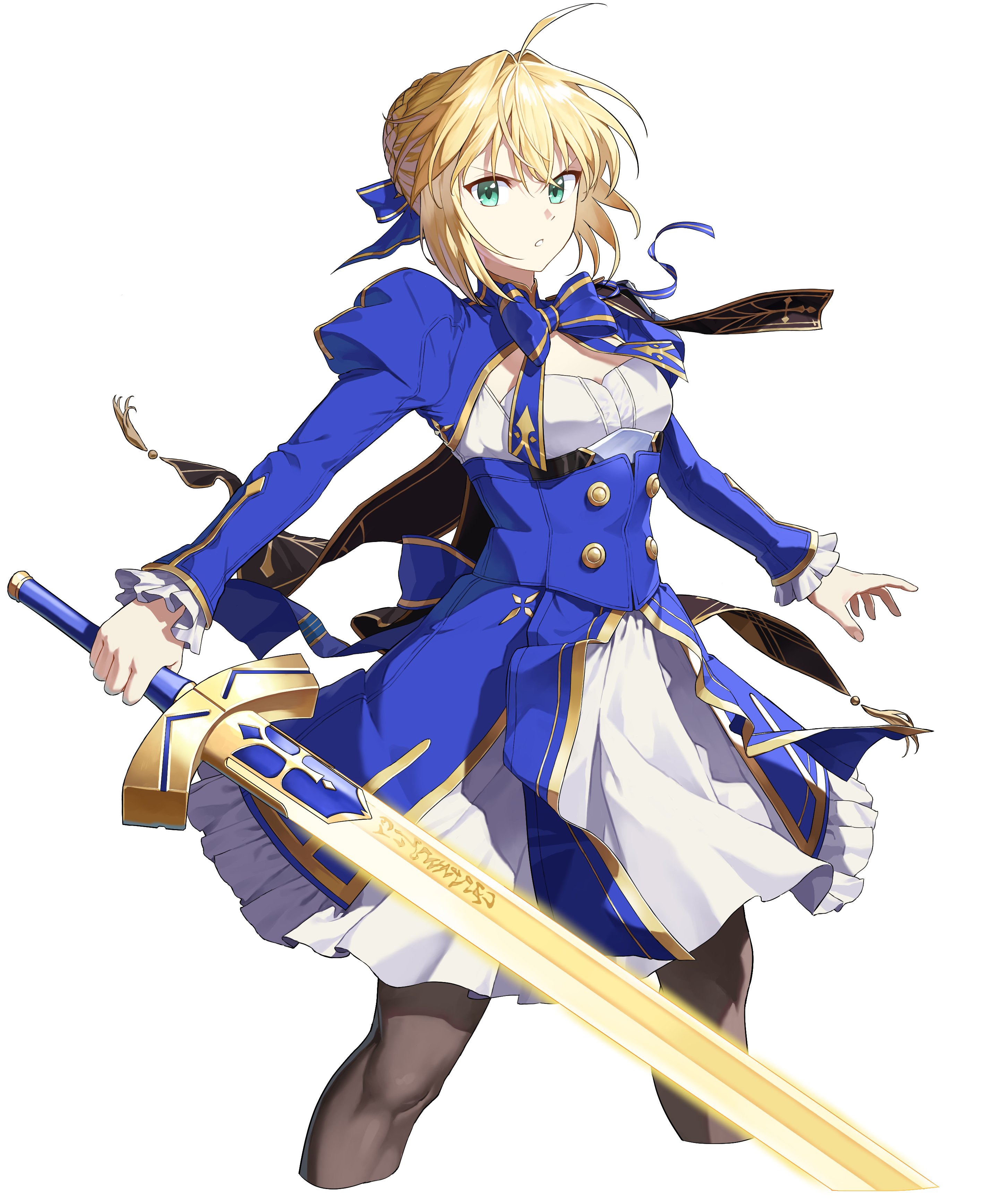 1girlahogeasdf 4532black pantyhoseblonde hairblue bowblue bowtieblue dressblue ribbonbowbowtiebraidbraided bunbreastscleavage cutoutclothing cutoutcowboy shotdressfrillsglowingglowing weapongreen eyeshair bunhair ribbonholdingholding swordholding weaponlong sleeveslooking at viewermedium breastspantyhoseribbonshort hairsidelockssimple backgroundsoloswordweaponwhite background