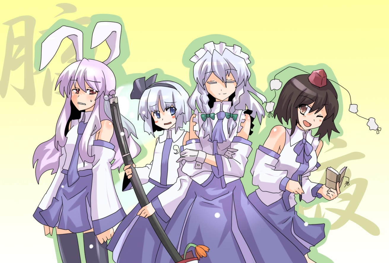 1girl4komaanimal earsbare shouldersblack hairblue eyesbrown eyesclosed eyescomiccosplaydetached sleevesfemale focushair ribbonhakurei reimu (cosplay)hatkatanakochiya sanae (cosplay)maid headdressone eye closedrabbit earsred eyesribbonsoloswordthighhighstokin hatweaponzettai ryouiki