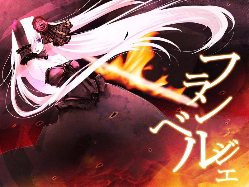 1girlblack dressdresselbow glovesfemale focusfireflowerfrillsglovesgothic lolitahair ribbonlolita fashionlong hairpink hairpurple eyesribbonrosesoloswordvery long hairweapon