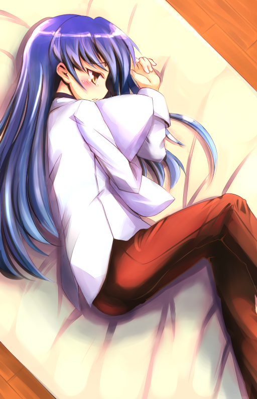 00s1girlblue hairblushbrown eyesfemale focushughugging objectlong hairlyingpillowpillow hugsolo