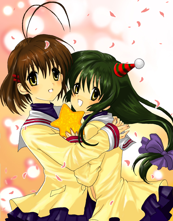 00s2girlsantenna hairbrown eyesbrown hairgreen hairhathuglong hairlooking at viewermultiple girlsparty hatschool uniformshort hairstarfish