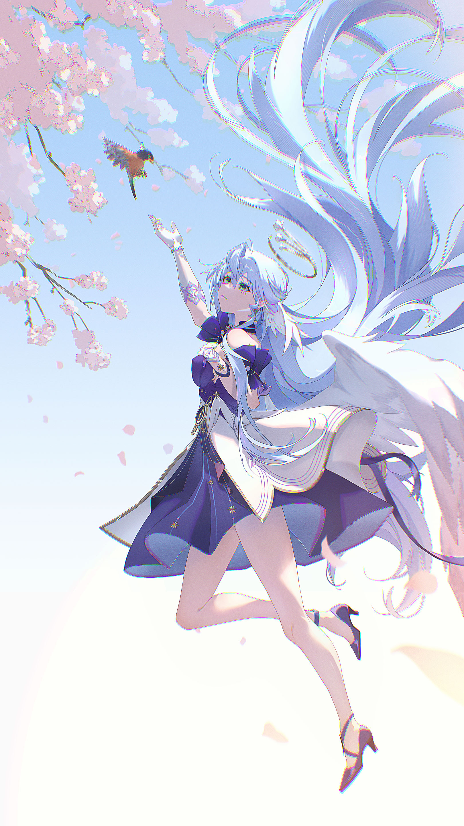 1girlaqua hairarm upbirdcherry blossomsdetached sleevesdressearringsfalling petalsfeathered wingsfloating hairglovesgold trimgreen eyeshair between eyeshalohand on own chesthead wingshigh heelsjewelrylong hairlow wingspetalspink petalspurple dressshort sleevesstraplessstrapless dressvery long hairwhite dresswhite gloveswhite wingswingsyellow halo
