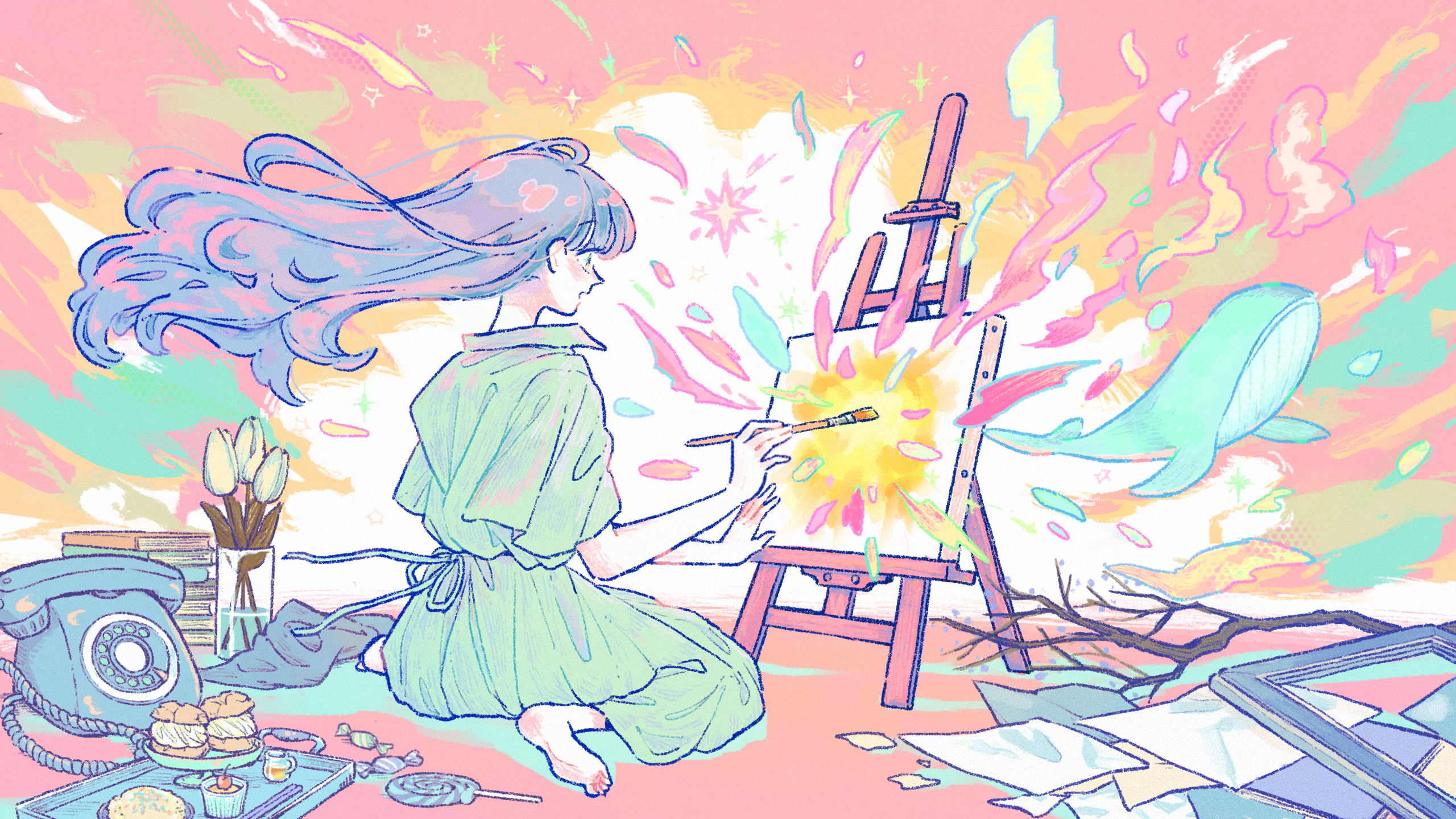 1girlantique phonebarefootbookbranchcandycupcakedresseaselfloating hairflowerfoodfrom behindfull bodyglassgreen dressgreen flowerholdingholding paintbrushlollipoplong hairmulticolored hairopen mouthpaintbrushpainting (action)painting (object)pastel colorsphonepicture framepile of booksrotary phoneshort sleevessittingtraytuliptwo-tone hairwarizawhalewrapped candy
