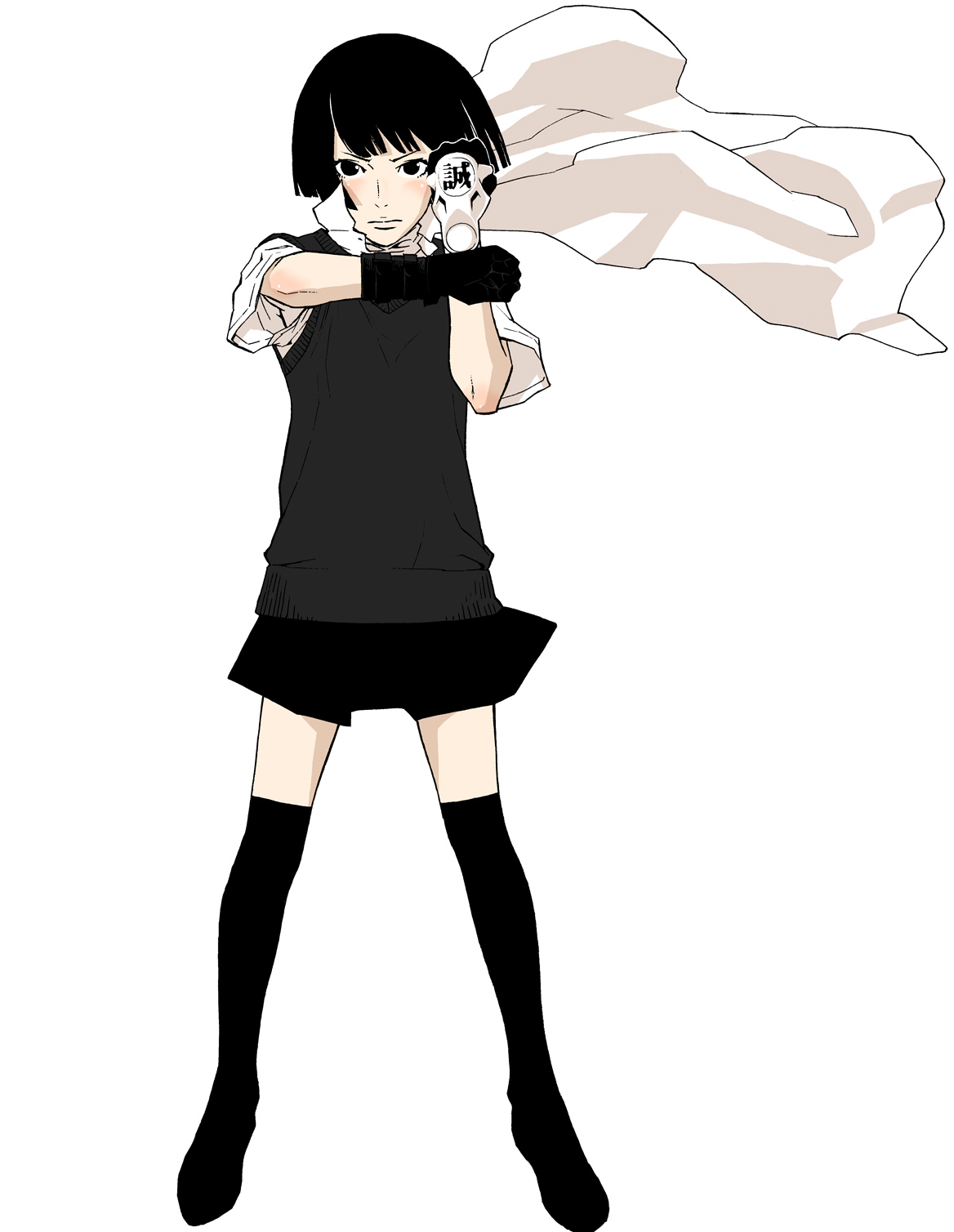 black eyesblack hairglovesscarfschool uniformshort hairskirtsolosweater vestthighhighszettai ryouiki