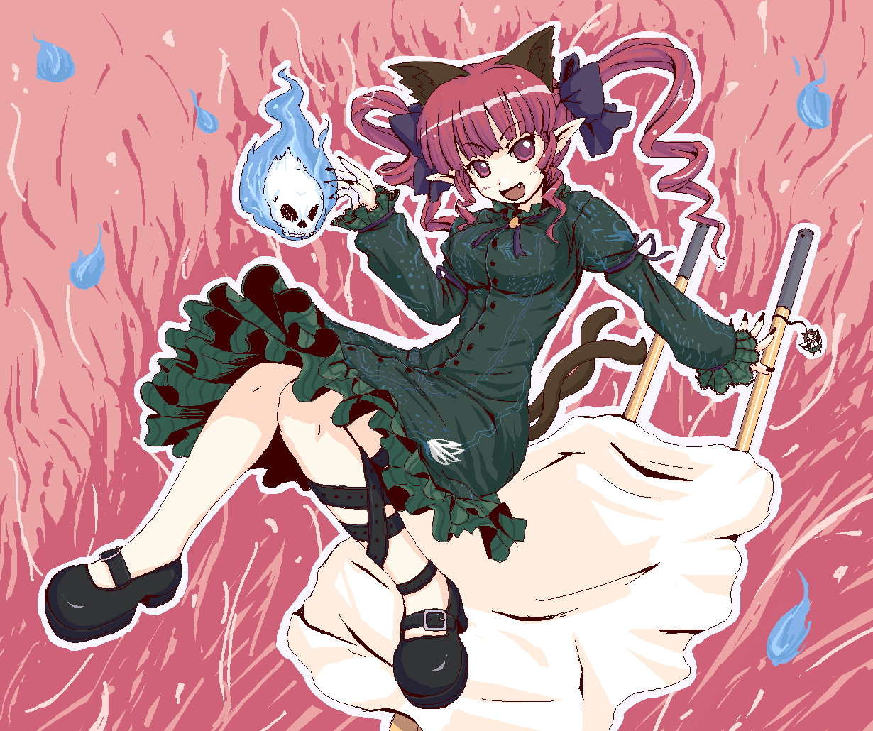 1girlanimal earscameocat earscat girlcat tailfangfemale focushair ribbonpointy earsred eyesred hairribbonskullsolotailtwintailswheelbarrow
