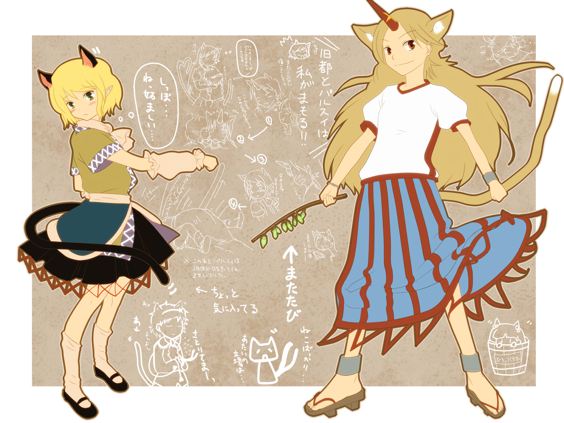 zundaa, suo kazusa, yozora (nue no onmyouji), nue no onmyouji, 2girls, anger vein, angry, animal ears, animal hands, black hair, blush, camera, cat ears, cat girl, cat paws, cat tail, chibi, chibi inset, cleavage cutout, clenched teeth, clothing cutout, elbow gloves, embarrassed, gloves, multiple girls, open mouth, red eyes, skirt, smile, sweat, tail, teeth, twintails