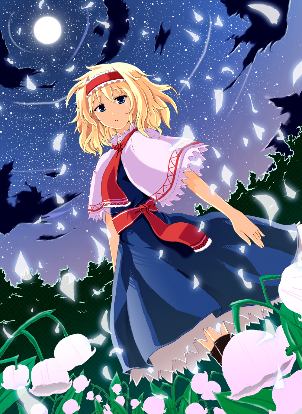 1girlblonde hairdressfemale focusflowerhairbandmoonnightnight skyshort hairskysolostar (sky)star (symbol)starry sky