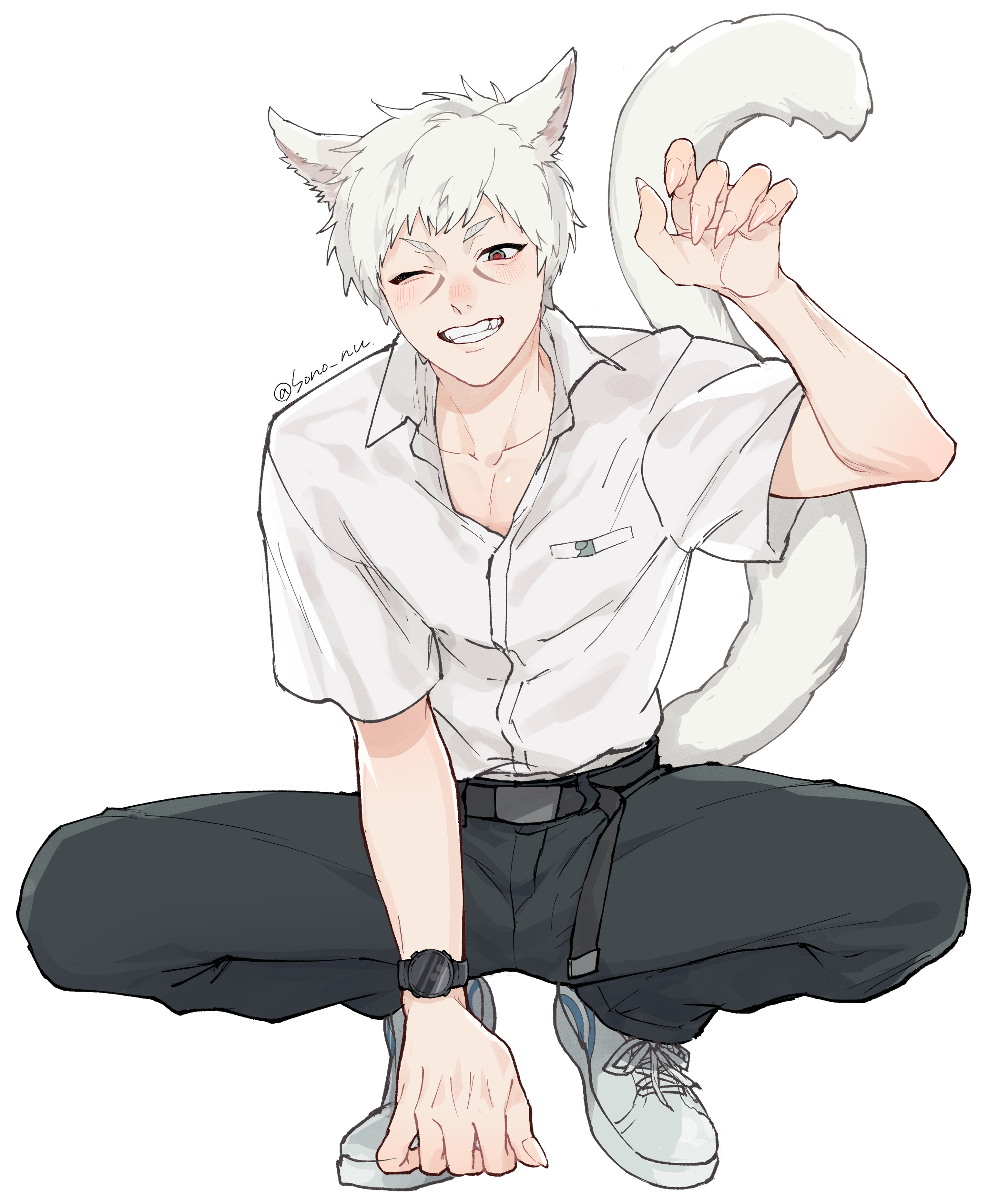 1boyanimal earsbeltblack beltblack pantsblushcollared shirtfingernailsgrinmale focusnose blushone eye closedpantspaw posepocketred pupilssharp fingernailsshirtshirt tucked inshoesshort hairshort sleevessimple backgroundsmilesolosquattingtailtwitter usernamewatchwhite backgroundwhite hairwhite shirtwhite shoeswristwatch