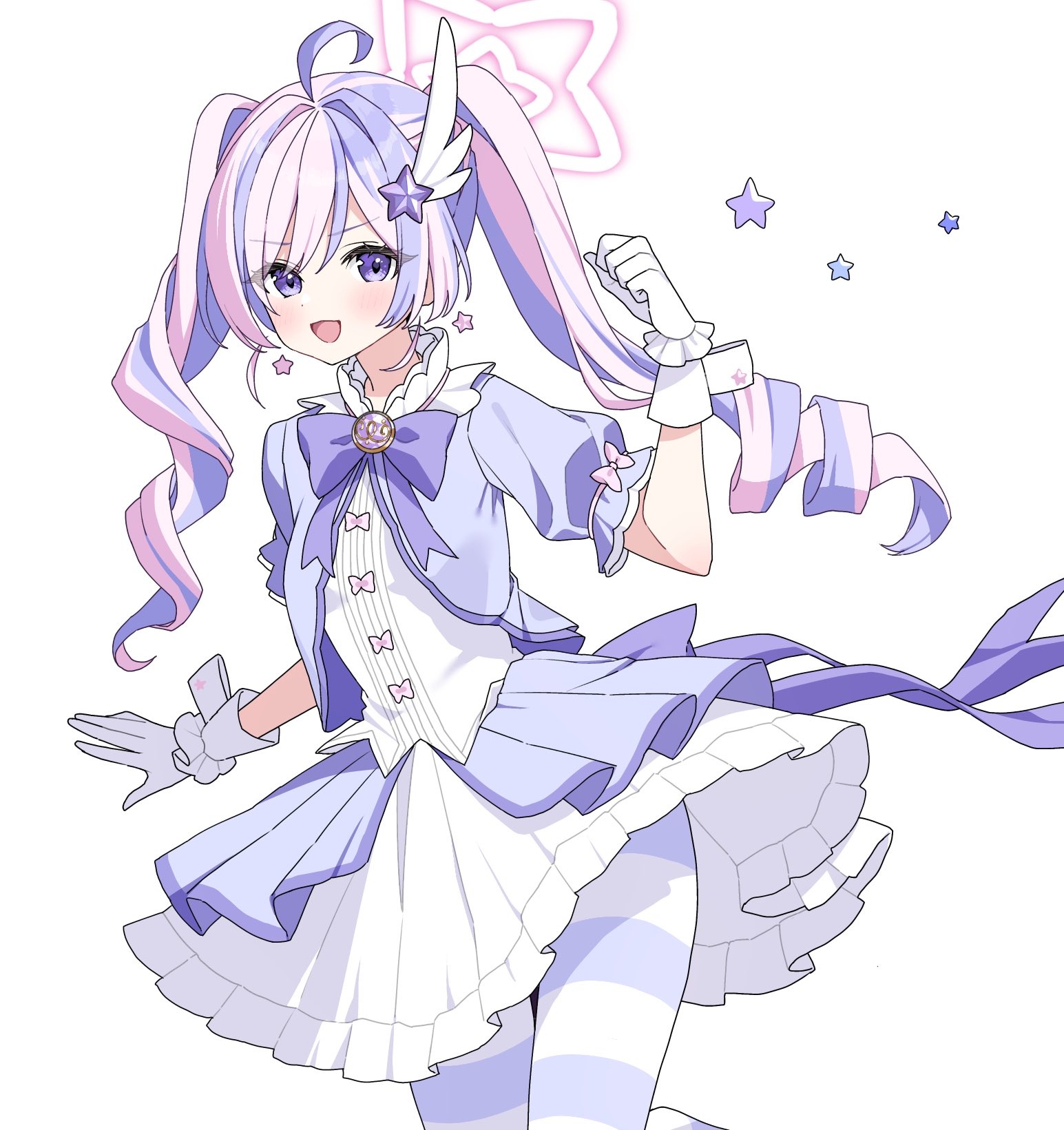 1girlahogebowdressdrill hairgloveshair ornamentlong hairlooking at viewermagical girlmulticolored hairofficial alternate costumeofficial alternate hairstyleopen mouthpantyhosepink bowpink hairpuffy short sleevespuffy sleevespurple bowpurple hairshort sleevessmilestriped clothesstriped pantyhosetwin drillstwintailstwo-tone hairvery long hairwhite gloveswhite wrist cuffswrist cuffs