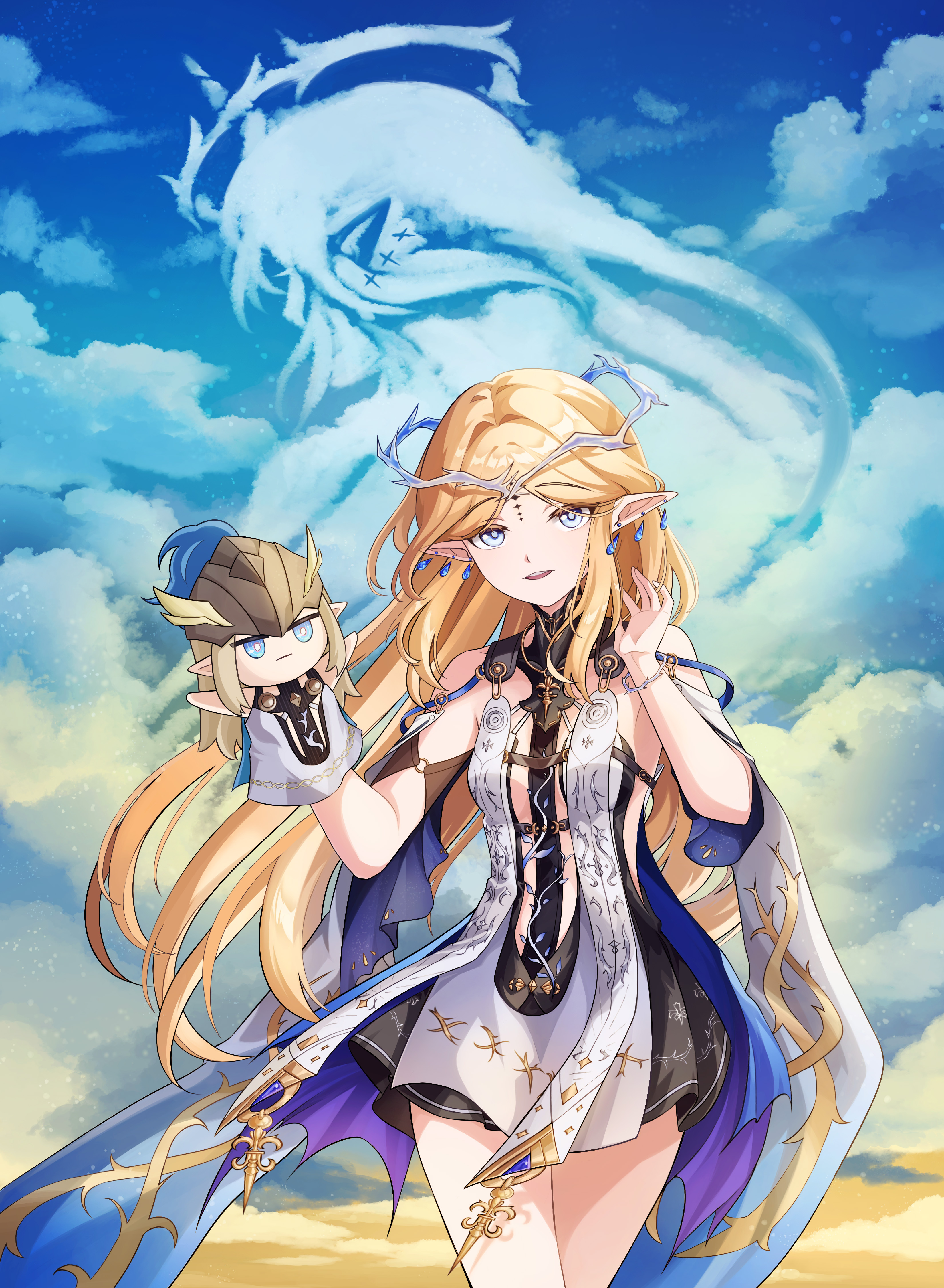 1girlbare shouldersblack dressblonde hairblue eyesbreastscloudcowboy shotcrown of thornsdressearringshand puppethand upiv (tpgs5473)jewelrylong hairlooking at viewermultiple earringsnecklaceparted bangsparted lipspointy earspuppetsmall breastssmilesolotabardthighswhite tabard