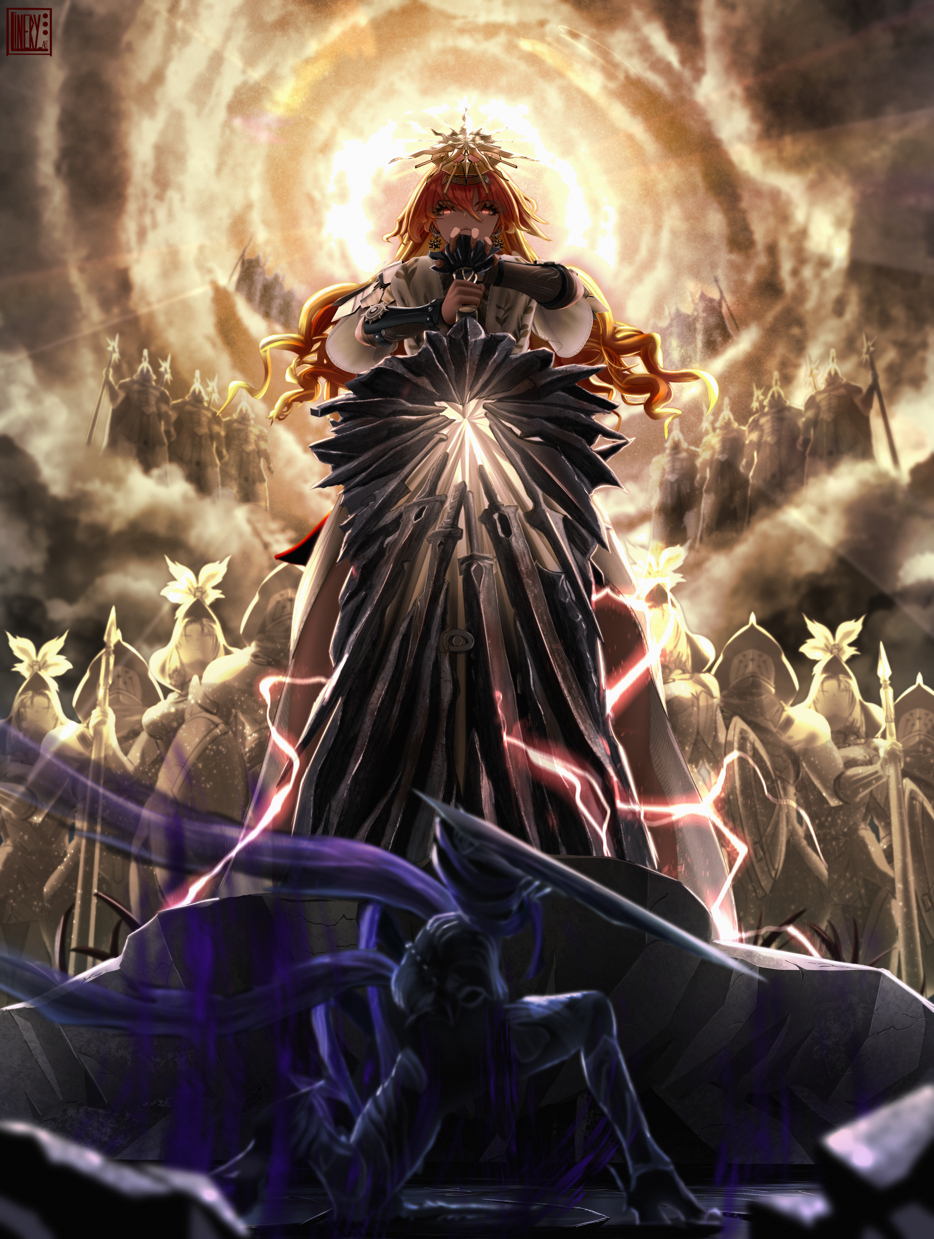 1girlarm armorearringselectricityfalse sovereign (wuthering waves)from belowgreatswordhair between eyesheadgearholdingholding swordholding weaponjewelrylong hairlooking at viewerlooking downorange hairred eyessun earringsswordtacet discord (wuthering waves)two-handedweapon