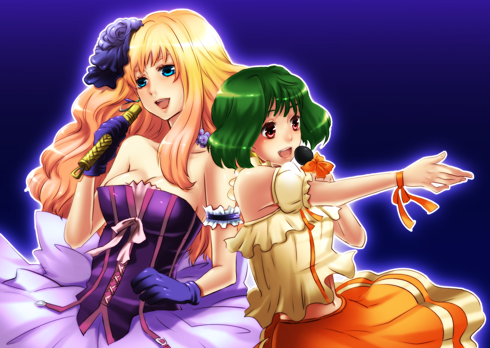 00s2girlsbare shouldersblonde hairblue eyesearringsglovesgreen hairjewelrymicrophonemultiple girlsred eyessmile