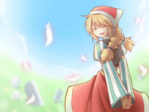 1girlblouseblue shirtclosed eyesfeathersfemale focusheadscarfred headscarfshirtsolostriped clothesstriped shirt
