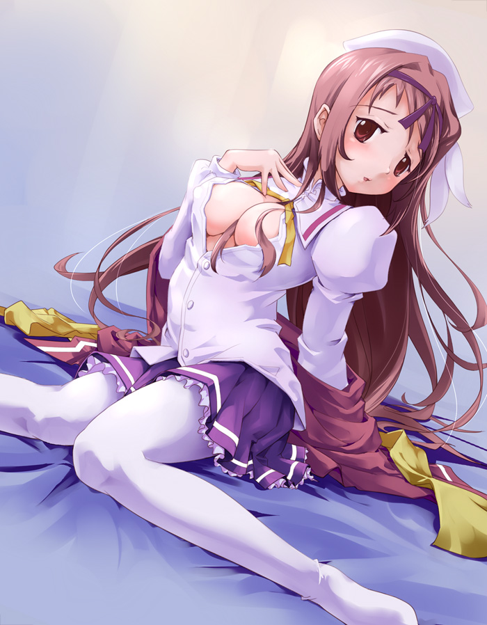 1girlbreastsfemale focushair ribbonhatlarge breastslegslong hairopen clothesopen shirtpantyhoseribbonschool uniformshirtsolothighhighswhite pantyhose