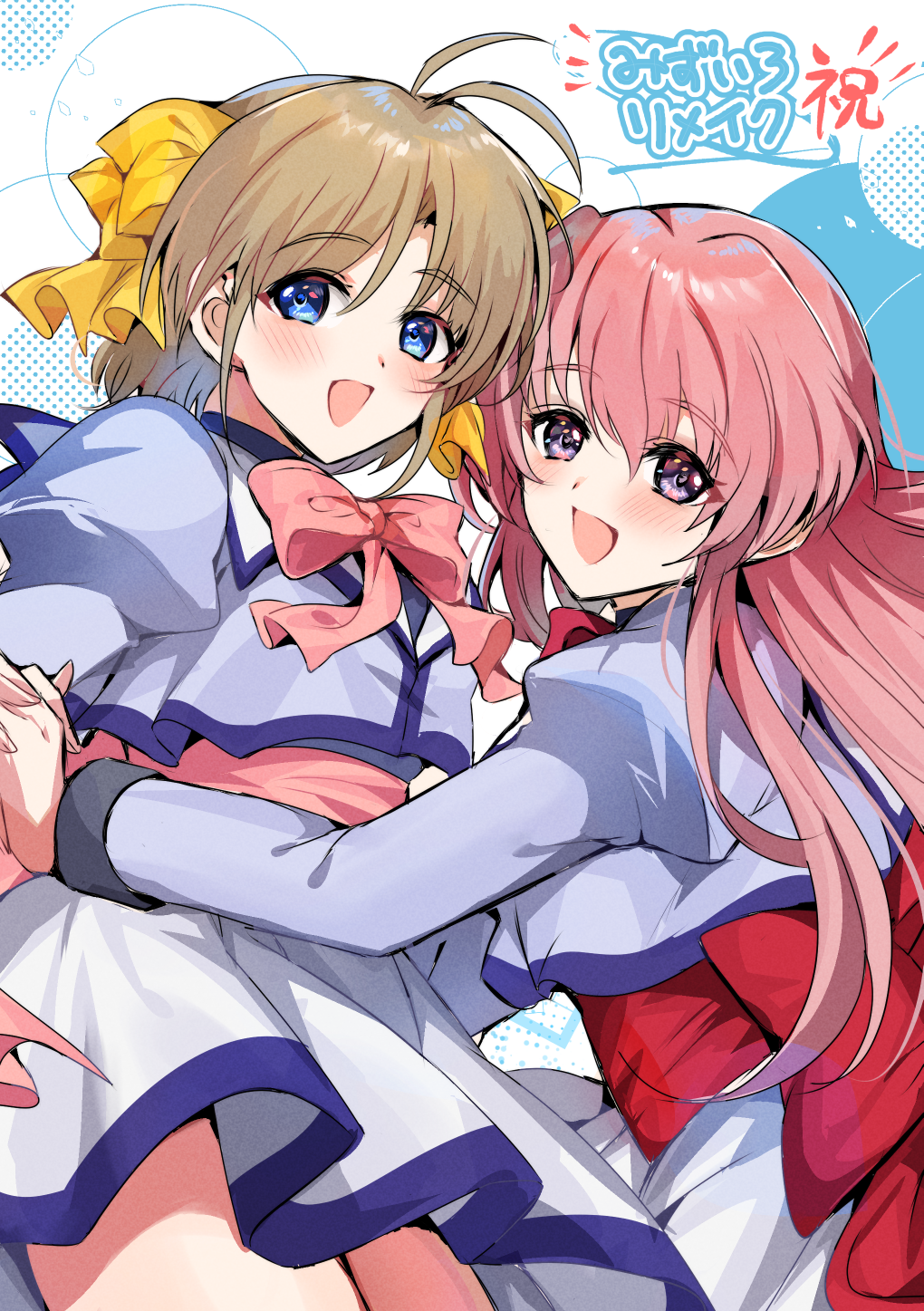 2girlsblue eyesbowbrown hairlong hairlong sleevesmultiple girlspink hairpuffy long sleevespuffy sleevespurple eyesschool uniformshort hairsmileyellow bow