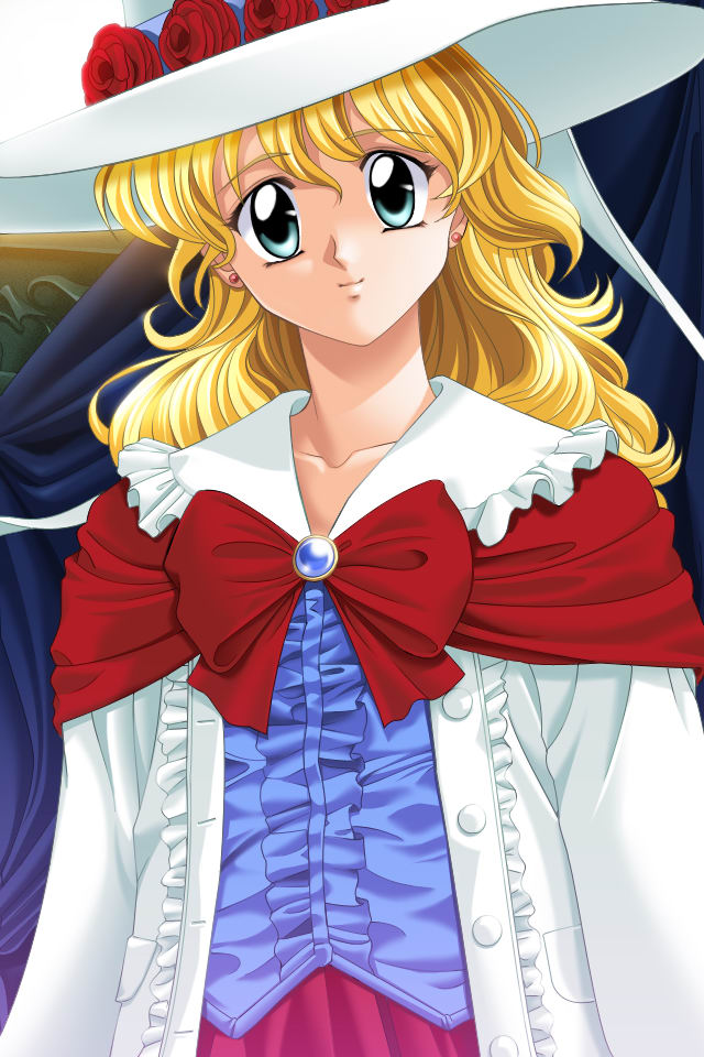 1girlaqua eyesblonde hairblue eyesbowbroochearringsfemale focusflowerfrillshatjewelrylong hairribbonrosesmilesolosun hat