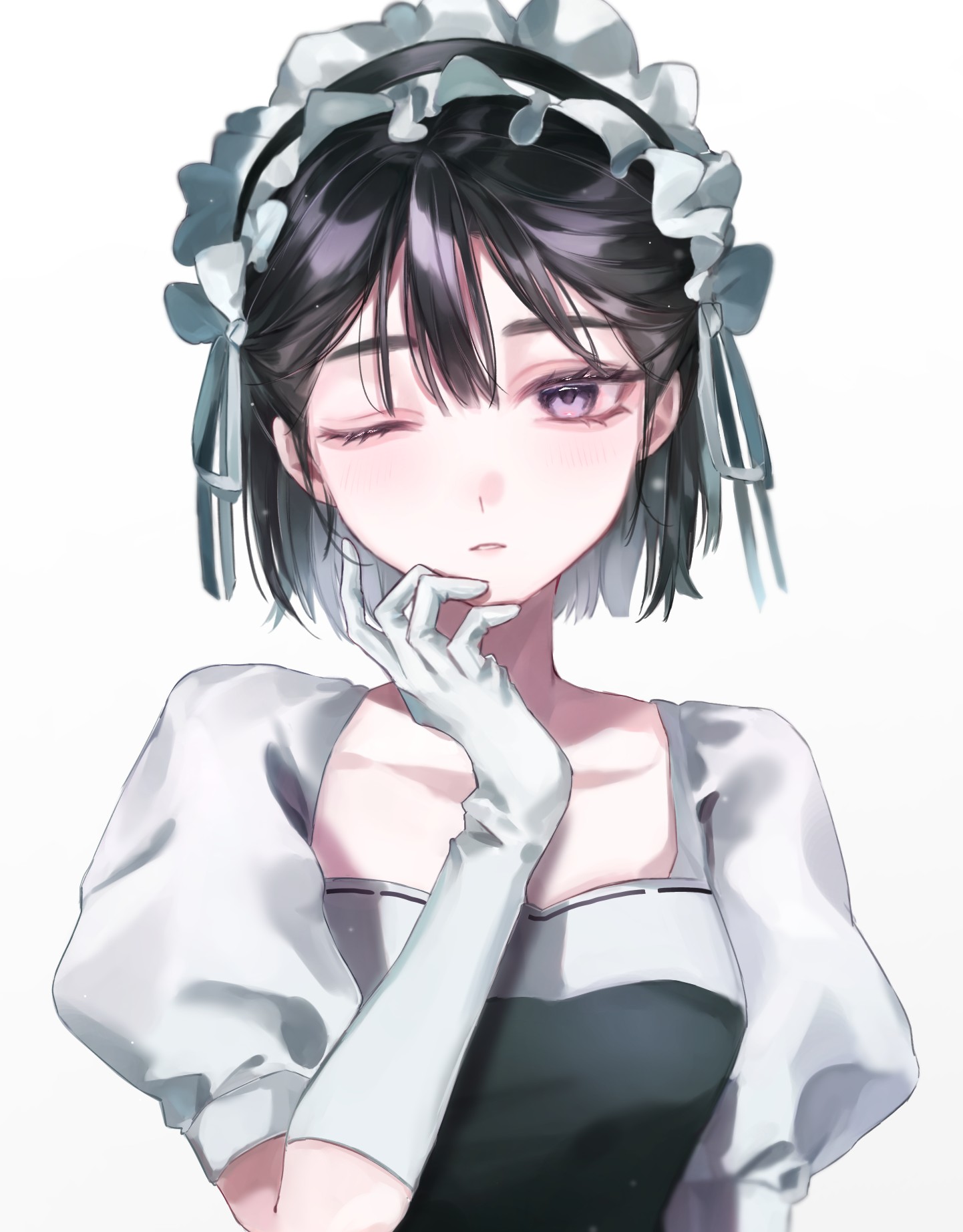1girlblack hairgloveshand on own facemaidmaid headdressofficial alternate costumeone eye closedparted lipsportraitpuffy short sleevespuffy sleevespurple eyesshort hairshort sleevessolowhite gloveswhite sleeves