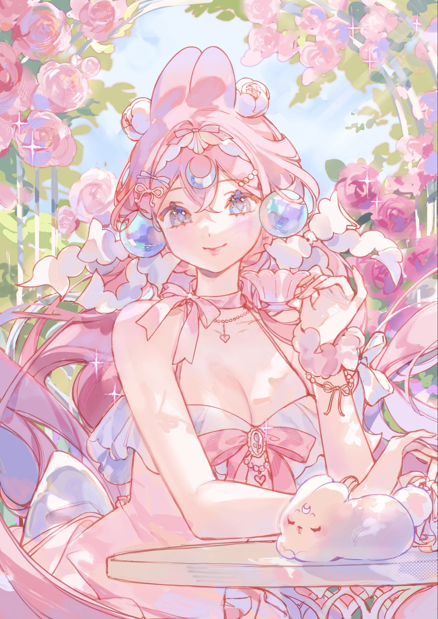 1girlanimalanimal earsblue eyesblue skybraceletbreastschokercleavageclosed mouthcupdayflowerfrillshair flowerhair intakeshair ornamenthaircliphairpinholdingholding cupjewelrylipslong hairlooking at viewermakeupmedium breastsoutdoorspink chokerpink flowerpink hairpink rosepink themerabbitrabbit earsribbon chokerroserouge (makeup)sittingskysmilesolosunlightteacupvery long hair