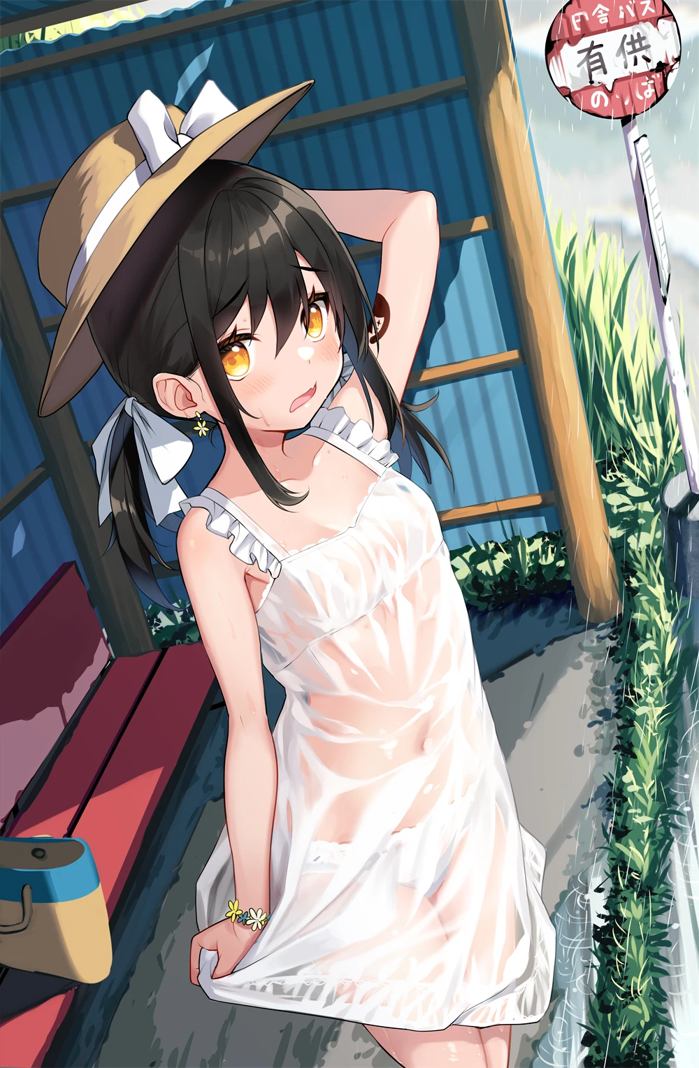 1girlarm tattoobagbenchblack hairblushbowbraceletbreastsbus stopbus stop signdressearringsembarrassedflower earringsgrasshandbaghathat bowjewelrynavelno braopen mouthpantiesrainsee-through clothessee-through dresssmall breastssolotattoounderwearwetwet clotheswhite bowwhite dresswhite pantiesyellow eyes