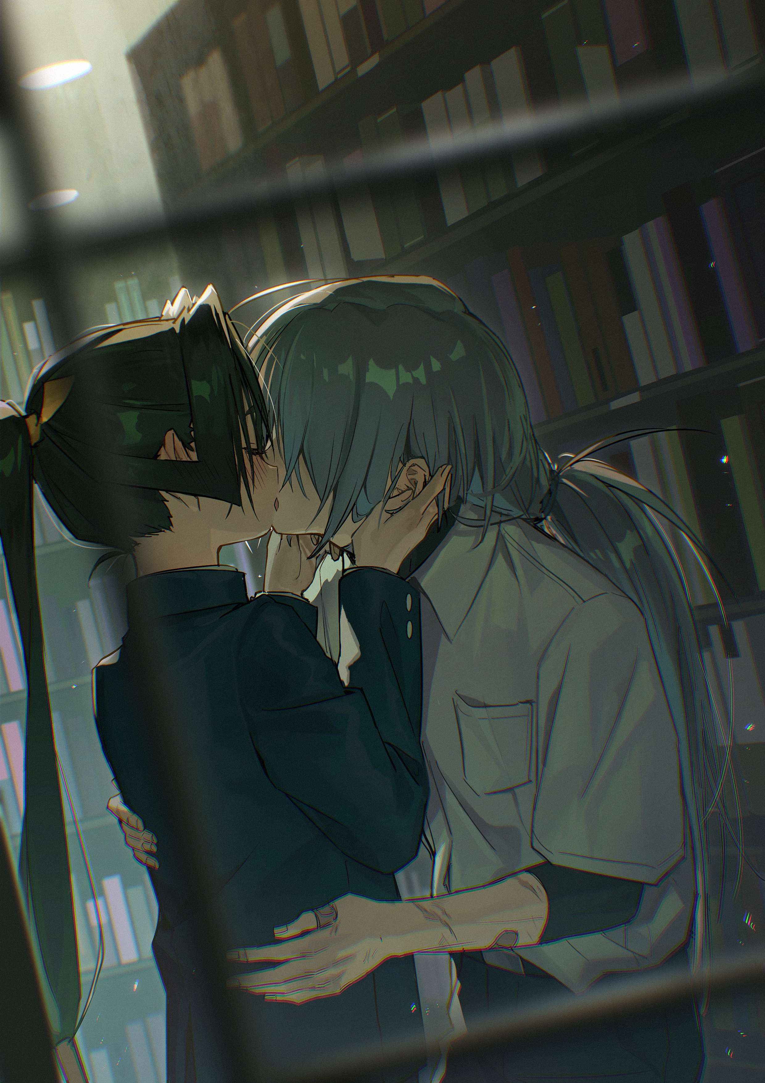 2boysbacklightingbandaidbandaid on armblack hairblurryblurry foregroundbookshelfbowbreast pocketchromatic aberrationclosed eyescollared shirtfrom outsidefrom sidegrey hairhair bowhair intakeshair over eyeshand on another's waisthands on another's facekisslibrarylight particlesmale focusmultiple boyspocketprofilescarscar on armshirtshirt tucked inwhite shirtwindowyaoiyellow bow