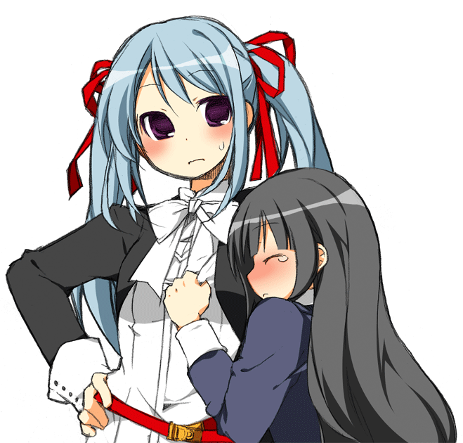 10s1boy2girlsbeltblack hairblack jacketblue hairblunt bangsblushbowbowtieclosed eyesclosed mouthclothes grabfrownhair ribbonhand on own hipjacketlong hairlong sleeveslooking at viewermultiple girlsno pupilsnose blushopen clothesopen jacketprofilepurple eyesred ribbonribbonshirtshirt grabsimple backgroundsweatswept bangstwintailsupper bodyvery long hairwhite backgroundwhite bowwhite bowtiewhite shirtwince