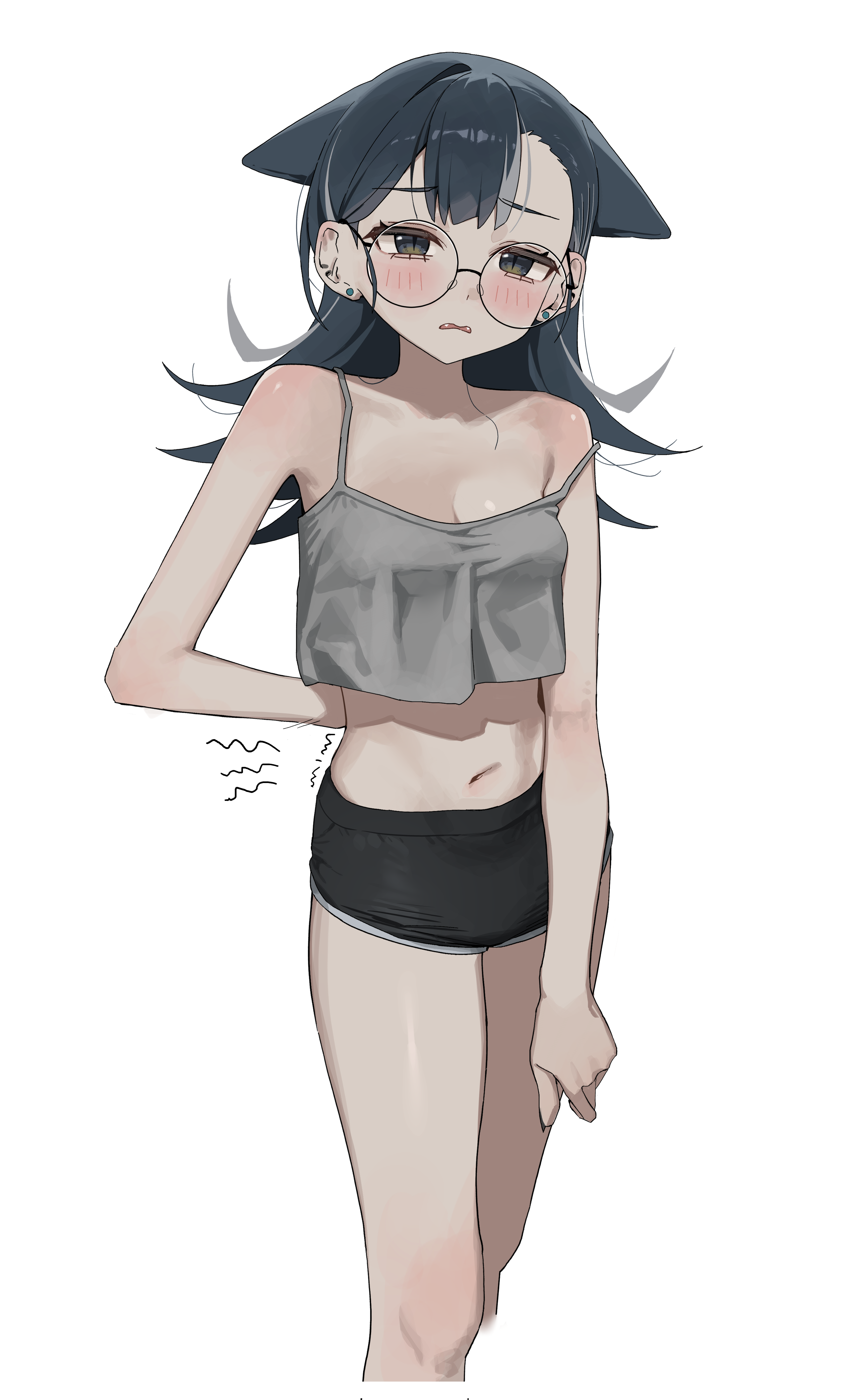 1girlarm behind backbare armsbare shouldersblack hairblack shortsblack-framed eyewearblushbreastsbrown eyescamisolecleavagecollarbonecrop topcrop top overhangcropped legsearringsfangsfeet out of frameglassesgrey camisolegrey hairhalf-closed eyesjewelrylong hairlooking at viewermedium breastsmulticolored hairnavelparted lipsround eyewearshort shortsshortssimple backgroundslit pupilssolostrap slipstreaked hairstud earringstremblingwavy mouthwhite background